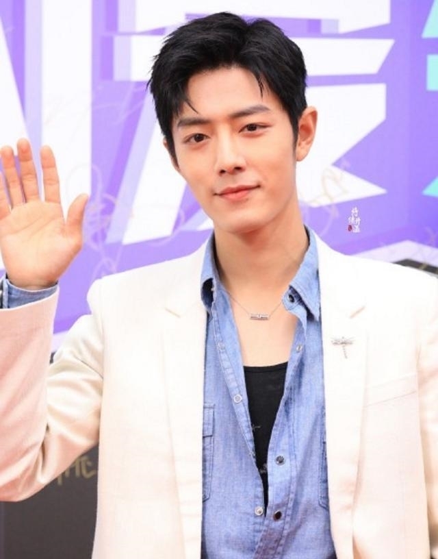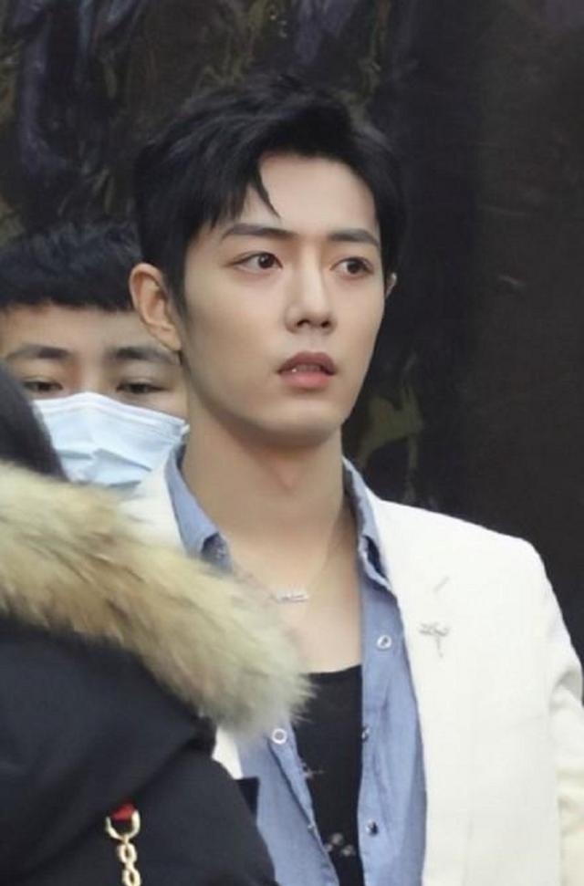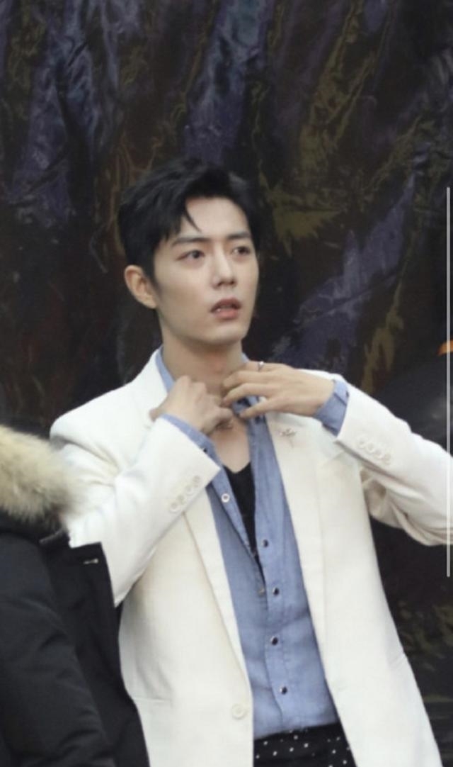 照片中,肖战穿着一身白色西装,里面搭配着淡蓝色衬衫,衬衫里面是一件超薄的黑色背心,下面搭配着黑色长裤,一双大长腿超绝。